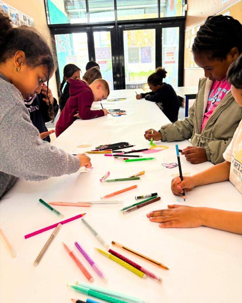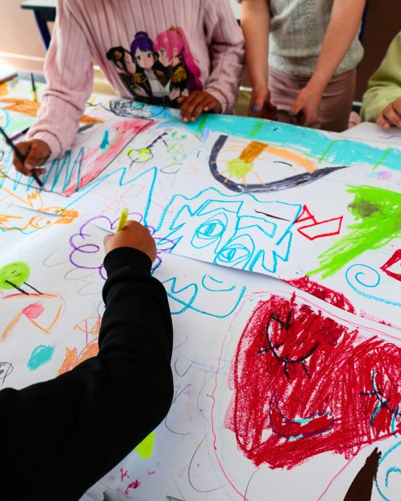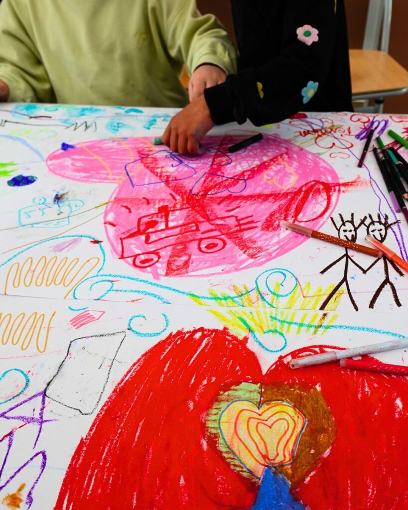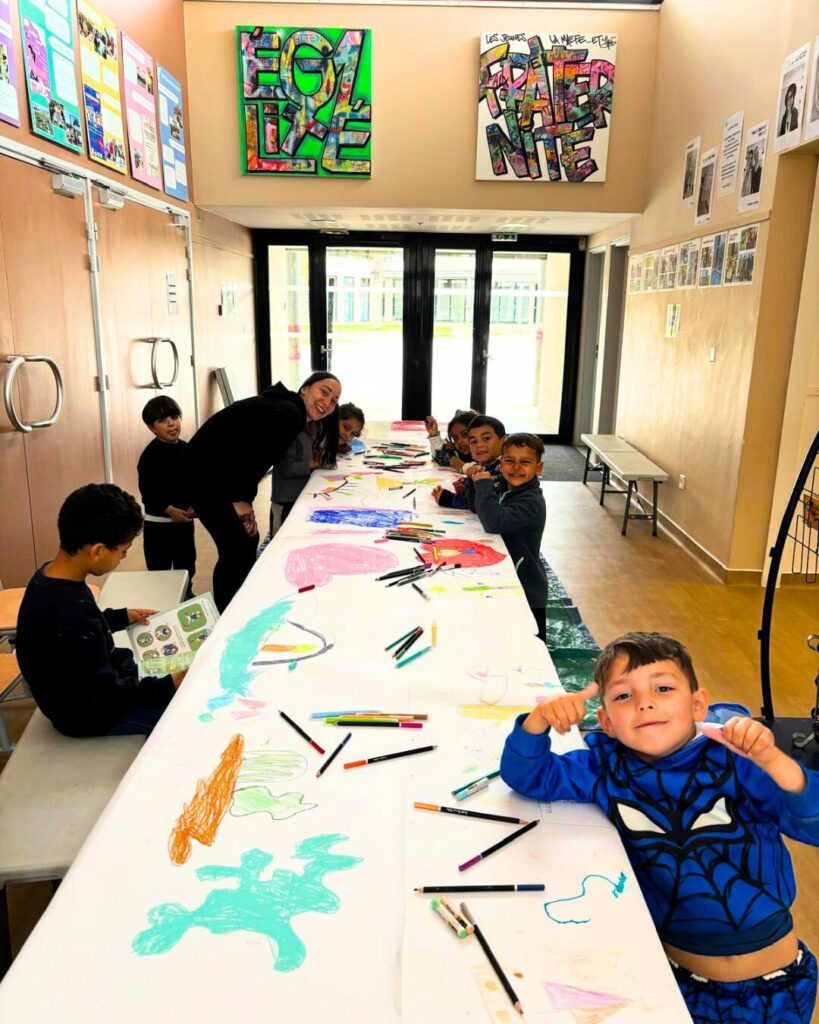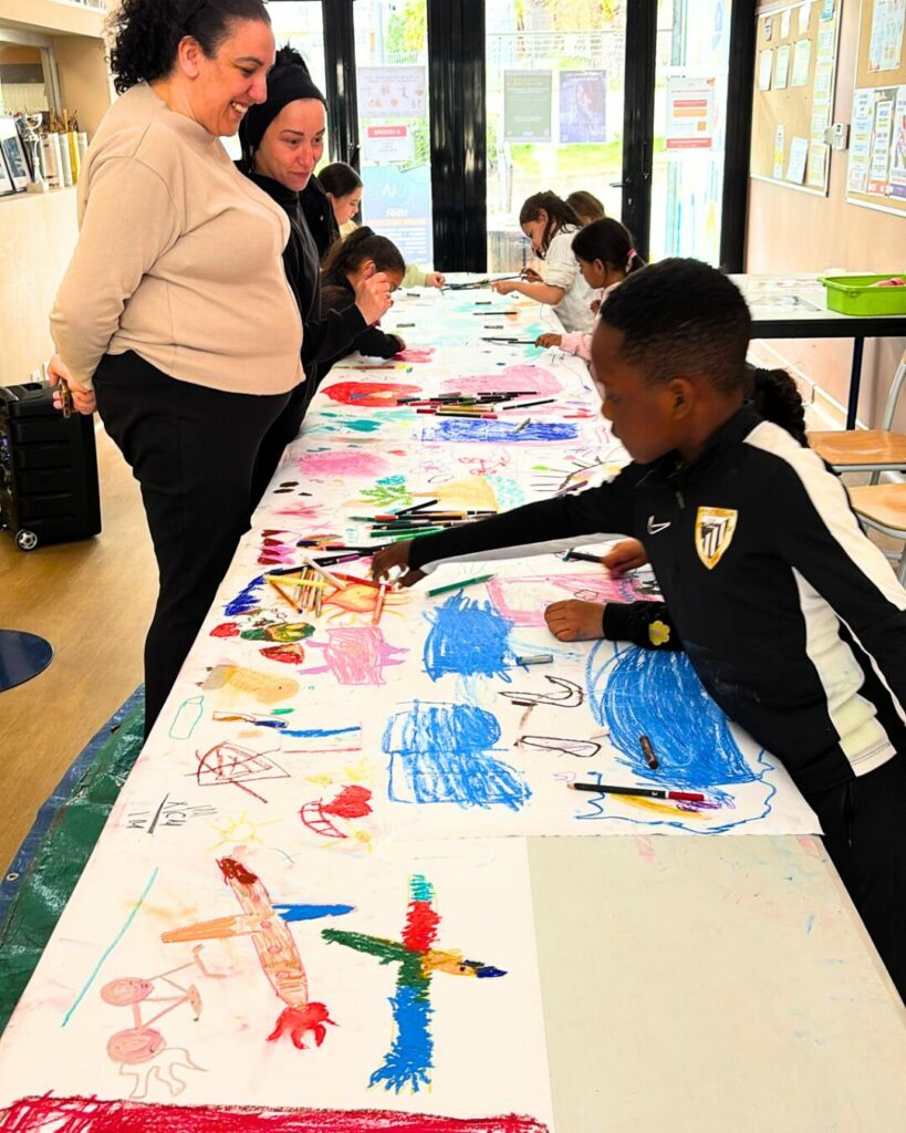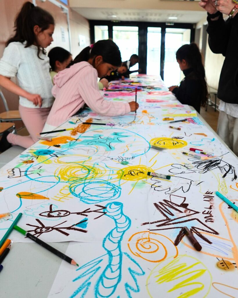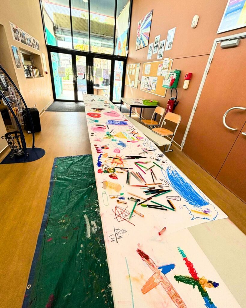 Et bien, quels souvenirs ! Initié par Morgane, nous avons invité parents et enfants à dessiner tous ensemble ! Sur une table de plus de 5 mètres de long, les petits comme les grands devaient donc apposer leurs dessins sur le thème du voyage ! Finalement beaucoup d’amour se dégageait de cette fresque qui sera bientôt illustrée sur nos murs, qui sait ?