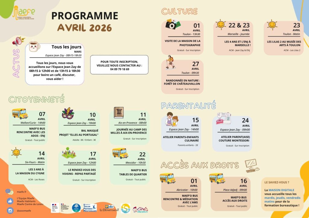 Un Maef’O Bus se tiendra devant l’Abricotier pour vous présenter le programme du mois et discuter avec vous de votre situation personnelle !
